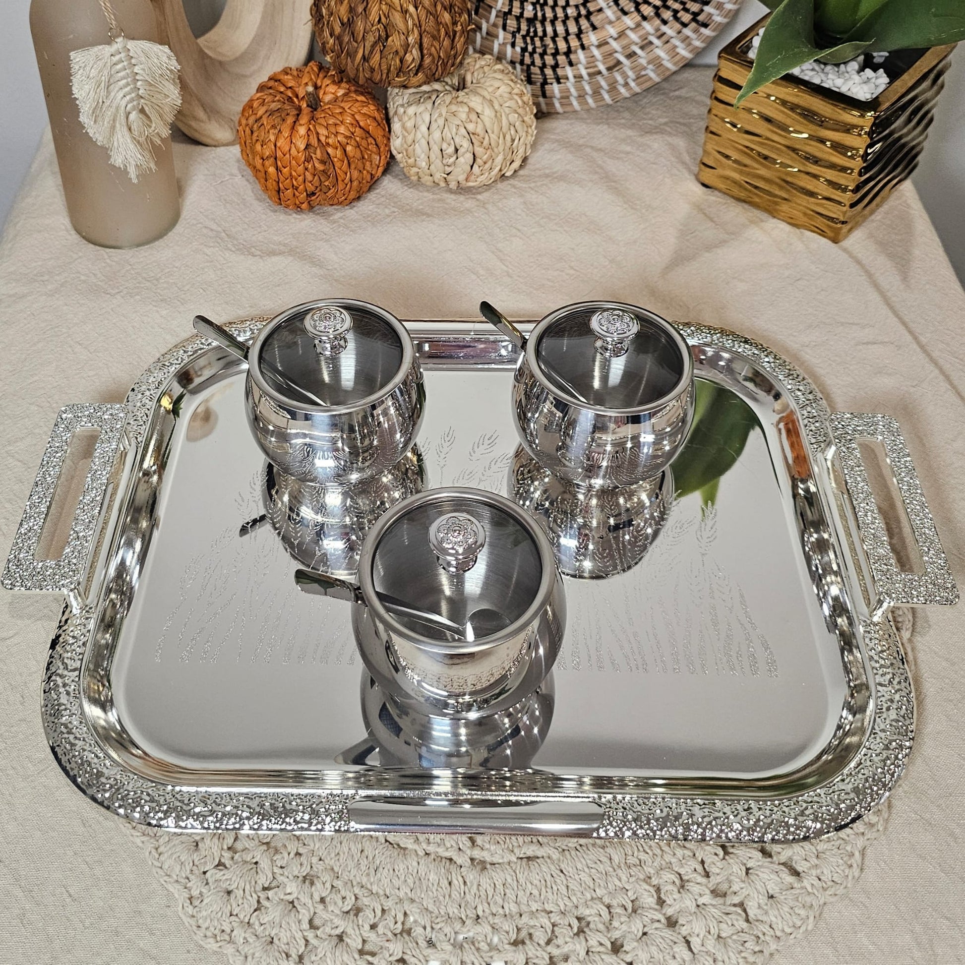3 pcs Elegant Sugar Pot with Spoon and Crystal Knob Lid ( set of 3pcs ) - Silver Design with Lid and Spoon Included